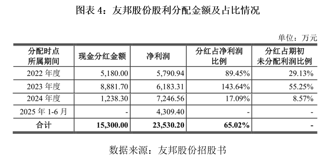 2022—2024年,友邦股份分别向股东派发现金股利5180万元、8881.7万元、1238.3万元,而同期净利润分别为5790.94万元、6183.31万元、7246.56万元。其中,2023年友邦股份净利润仅为6183.31万元,分红金额却高达8881.7万元,分红金额超过净利润,分红率达143.64%。