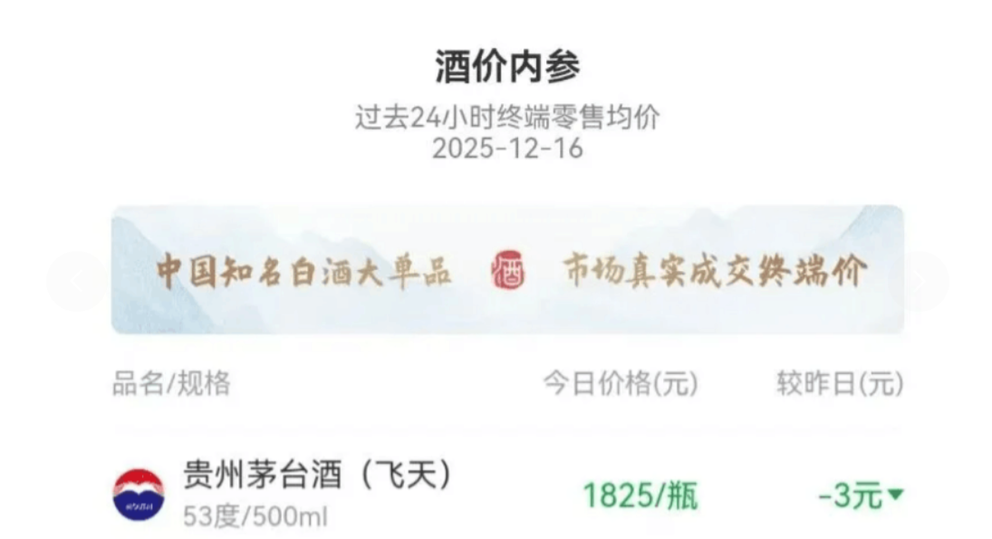 飞天茅台的稳定表现并非单一区域现象。12月16日,新浪财经“酒价内参”整合全国约200家直营经销商、社会经销商、批发市场与零售网点的实时数据,显示飞天茅台终端成交均价为1825元/瓶,较上周提升近20元。