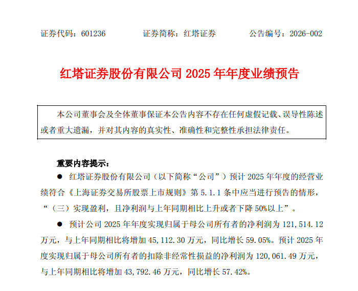 1月27日,红塔证券股份有限公司(601236.SH,下称“红塔证券”)发布公告称,经财务部门初步测算,预计2025年年度实现归属于母公司所有者的净利润为12.15亿元,同比将增加4.51亿元,同比增长59.05%;预计2025年年度实现归属于母公司所有者的扣除非经常性损益的净利润为12.01亿元,同比将增加4.38亿元,同比增长57.42%。