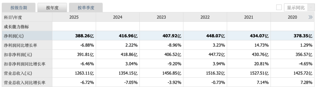 年报显示,2025年,光大银行实现营业收入1263.11亿元,同比减少6.72%;归母净利润388.26亿元,同比减少6.88%。