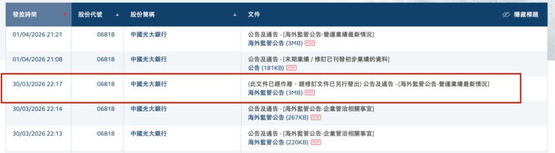4月1日,光大银行在港交所发布更正公告,调整相关数据后,该行H股年报已与A股版本一致,同时该行标注此前3月30日发布的错误文件作废。