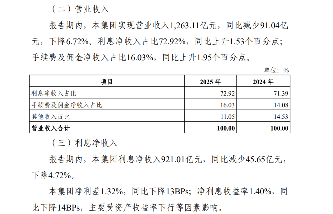 作为营收基本盘,2025年,光大银行实现利息净收入921.01亿元,同比下降4.72%,占营业收入的比例为72.92%,同比提升1.53个百分点。
