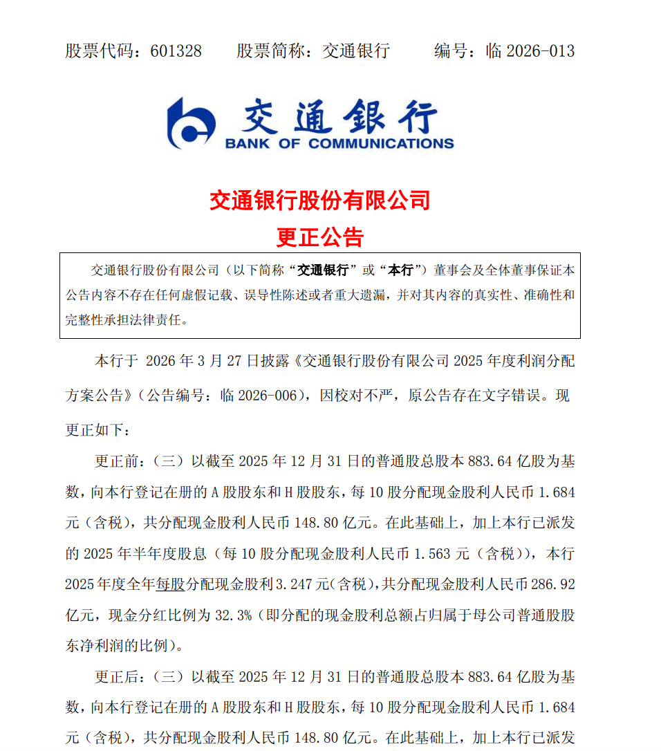 数日前,国有大行中的交通银行也曾在披露2025年度利润分配方案时,将“每10股派发现金股利3.247元(含税)”误写为“每股分配现金股利3.247元(含税)”。
