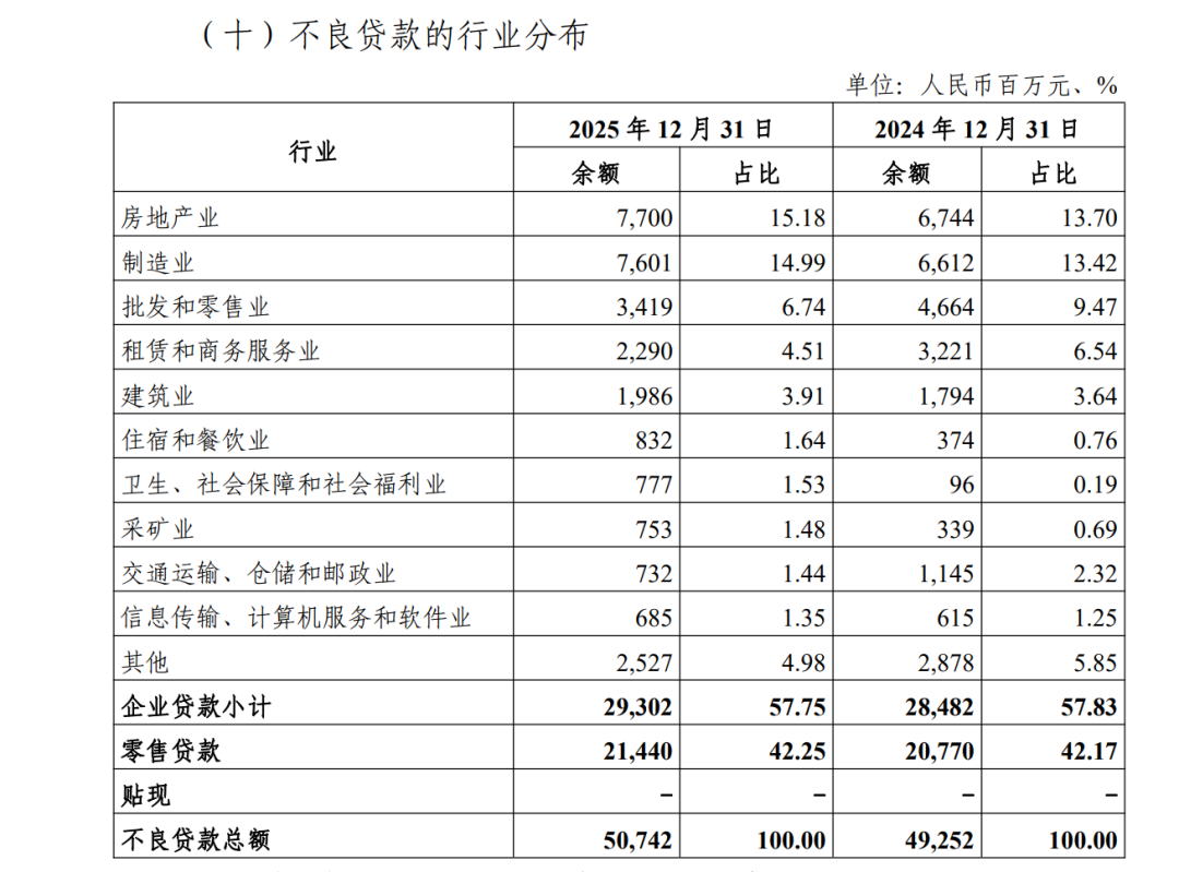 房地产业成为光大银行不良贷款的重灾区。截至2025年末,该行房地产业不良贷款余额77亿元,较2024年末增加14.18%,占全行不良贷款的比例为15.18%。